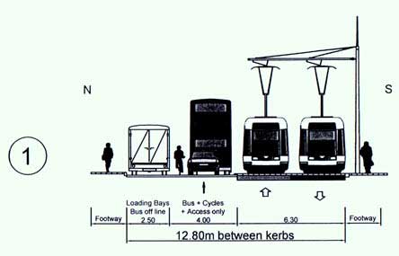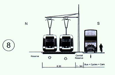 Report of the tram meeting Click here for a report of the public meeting held in Bush Hall on 25 March 2003, where the tram was introduced to the people of Hammersmith and Fulham Some graphics We present the following to help TfL diseminate its information. We wish to make the information available for informed comment to cyclists and other concerned persons. These graphics have been scanned from plans produced for Transport for London, London Trams. They are known as level 2 plans / issue 3. The drawing No. is D101169 / S208 and it is dated 13/02/03. The original plans have the logos of Scott Wilson and Aegis Semaly Ltd on them. These level 2 plans are in the public domain. There are also level 1 plans. Those are not in the public domain and it is not known what they show. To reduce file size and download time, street level detail has been removed, and to fit the page low resolution scans have been used and so they lack the clarity of the originals. The graphic below shows the section of the line in LBHF, as it follows the Uxbridge rd. The numbers 41, 42, 43, 44, 45 refer to the tram stops. The numbers 2, 8 and 1 refer to the cross-section type. These are indicated at the top of this graphic and below in the cross-sections. For other areas or greater detail see IN GREATER DETAIL at bottom of page |