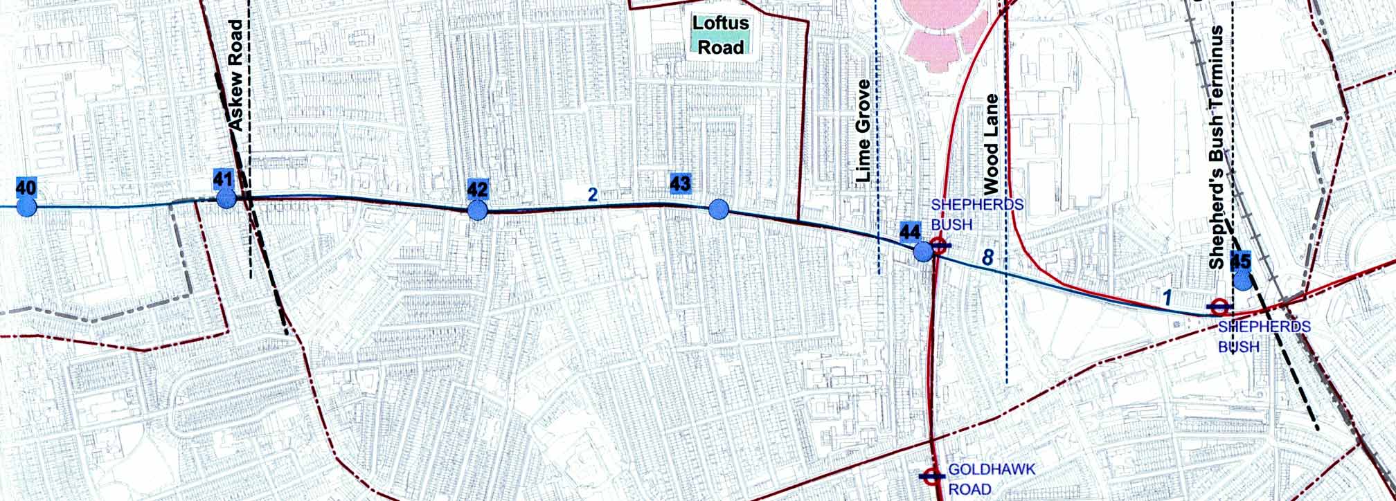 No. 8012BG05/A2 sheets A and B and dated 07/ 01/ 03. Detail of route These graphics have been scanned from plans produced for Transport for London, London Trams. They are known as level 2 plans / issue 3. The drawing No. is D101169 / S208 and it is dated 13/02/03. The original plans have the logos of Scott Wilson and Aegis Semaly Ltd on them. These level 2 plans are in the public domain. There are also level 1 plans. Those are not in the public domain and it is not known what they show. The blue numbers along the route refer to the cross-section type. The black numbers on a blue square refer to the number of the nearby tramstop shown by a blue circle. To reduce file size and download time, low resolution scans have been used and so they lack the clarity of the originals. |
